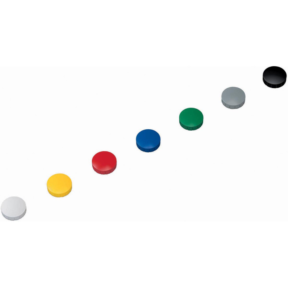Aimant solide de 24 mm de diamètre, vendu en boîte de 10 pièces aux couleurs assorties. Idéal pour fixer facilement documents, plans ou notes sur tableaux blancs, surfaces métalliques ou armoires, en contexte professionnel, éducatif ou domestique.