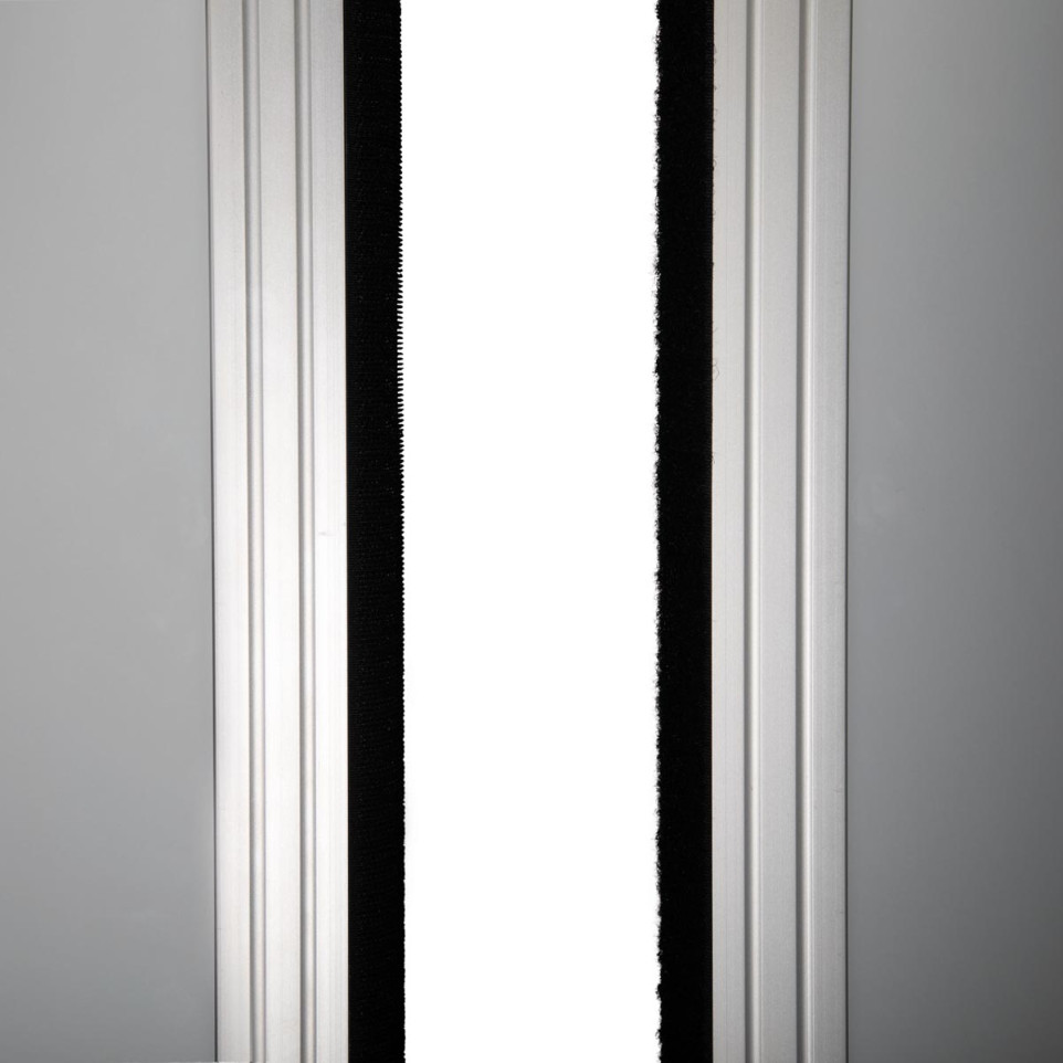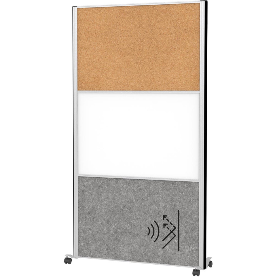 La cloison inclut un tableau blanc, un panneau en liège et un panneau acoustique gris foncé, le tout monté sur un cadre en aluminium.