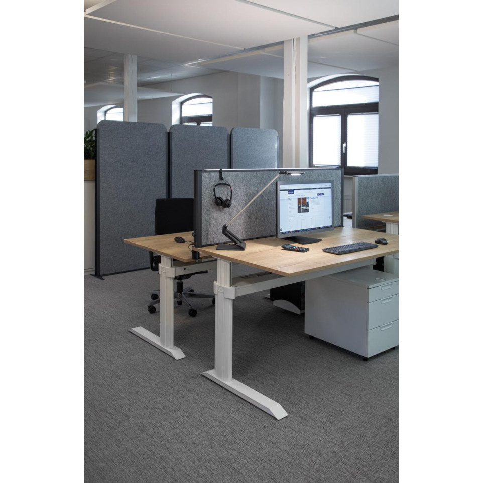 La cloison se fixe aisément sur un bureau à l’aide de ses deux pinces de serrage robustes, offrant une séparation visuelle et acoustique immédiate. Le module Uplight diffuse une lumière d’ambiance agréable, idéale pour créer un espace de travail calme et lumineux sans installation complexe.
