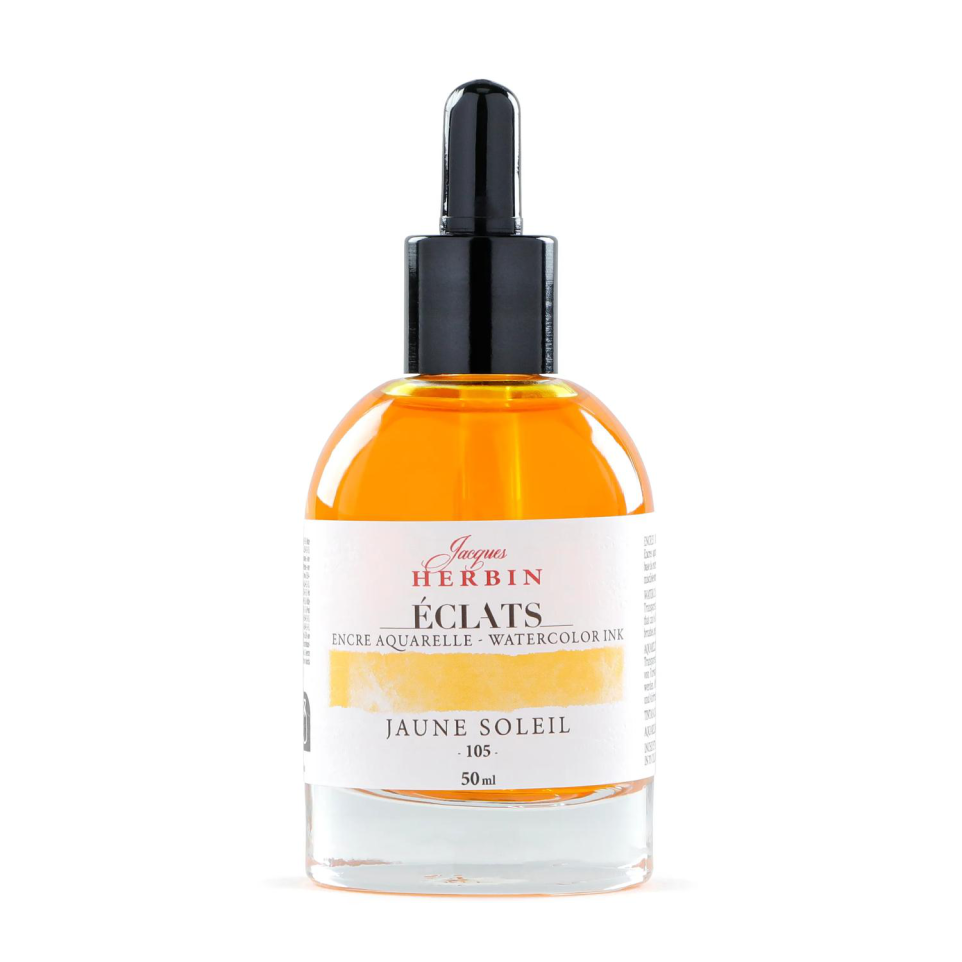 Encre aquarelle Eclats en 50ml Gamme d'encres pour artistes de 70 couleurs. 62 teintes aquarelles sont à base de colorants, elles sont uniques, lumineuses, intenses et transparentes. Encres miscibles entre elles et pouvant être utilisées telles quelles ou diluées pour donner naissance à une multitude de nouvelles nuances des plus vives au plus pastelles. 8 teintes sont pigmentées (blanc, or, cuivre, argent et les 4 teintes fluos (rose, vert, orange, jaune)). Ces encres sont pigmentées, opaques et couvrantes et sont à utiliser, de préférence, concentrées. L'encre Eclats est à utiliser de préférence au pinceau, à l'aérographe voire au porte-plume sur du papier aquarelle et du carton. Flacon en verre avec une pipette pour faciliter les mélanges. Les teintes sont disponibles en flacon de 250ml (63 couleurs) et 1000ml (5 couleurs). Fabrication en France. Livré par 4.