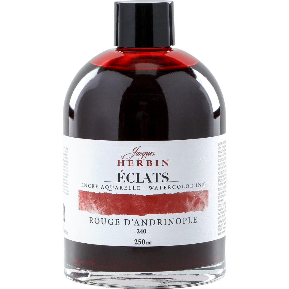 Encre aquarelle Eclats en 250ml Gamme d'encres pour artistes de 63 couleurs. 62 teintes aquarelles sont à base de colorants, elles sont uniques, lumineuses, intenses et transparentes. Encres miscibles entre elles et pouvant être utilisées telles quelles ou diluées pour donner naissance à une multitude de nouvelles nuances des plus vives au plus pastelles. La couleur blanche est pigmentée, opaque et couvrante et à utiliser, de préférence, concentrée. L'encre Eclats est à utiliser de préférence au pinceau, à l'aérographe voire au porte-plume sur du papier aquarelle et du carton. Flacon en verre avec une large base pour permettre une stabilité optimale sur la table de l'artiste. Les teintes sont disponibles en flacon de 50ml (70 couleurs) et 1000ml (5 couleurs). Fabrication en France. Livré par 2.