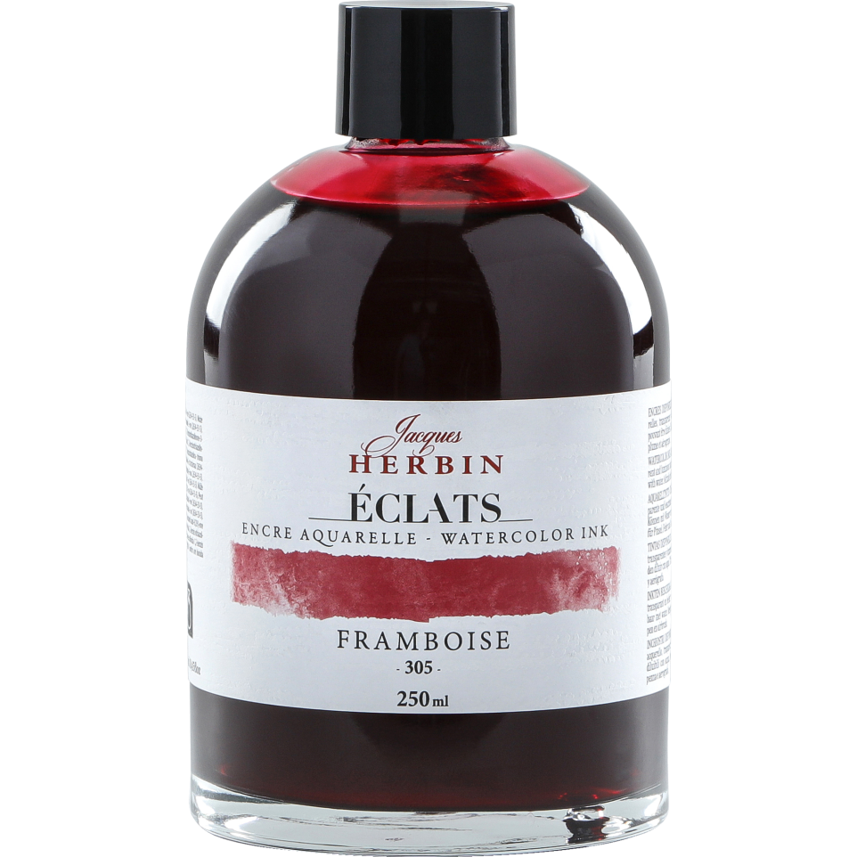 Encre aquarelle Eclats en 250ml Gamme d'encres pour artistes de 63 couleurs. 62 teintes aquarelles sont à base de colorants, elles sont uniques, lumineuses, intenses et transparentes. Encres miscibles entre elles et pouvant être utilisées telles quelles ou diluées pour donner naissance à une multitude de nouvelles nuances des plus vives au plus pastelles. La couleur blanche est pigmentée, opaque et couvrante et à utiliser, de préférence, concentrée. L'encre Eclats est à utiliser de préférence au pinceau, à l'aérographe voire au porte-plume sur du papier aquarelle et du carton. Flacon en verre avec une large base pour permettre une stabilité optimale sur la table de l'artiste. Les teintes sont disponibles en flacon de 50ml (70 couleurs) et 1000ml (5 couleurs). Fabrication en France. Livré par 2.