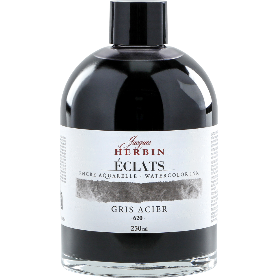 Encre aquarelle Eclats en 250ml Gamme d'encres pour artistes de 63 couleurs. 62 teintes aquarelles sont à base de colorants, elles sont uniques, lumineuses, intenses et transparentes. Encres miscibles entre elles et pouvant être utilisées telles quelles ou diluées pour donner naissance à une multitude de nouvelles nuances des plus vives au plus pastelles. La couleur blanche est pigmentée, opaque et couvrante et à utiliser, de préférence, concentrée. L'encre Eclats est à utiliser de préférence au pinceau, à l'aérographe voire au porte-plume sur du papier aquarelle et du carton. Flacon en verre avec une large base pour permettre une stabilité optimale sur la table de l'artiste. Les teintes sont disponibles en flacon de 50ml (70 couleurs) et 1000ml (5 couleurs). Fabrication en France. Livré par 2.