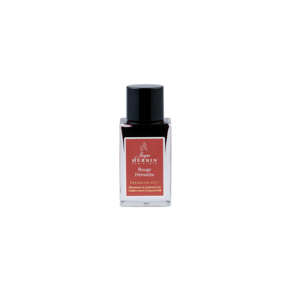 Encre 1670 à paillettes dorées 15ml Les Encres 1670, de la Collection exclusive Jacques Herbin Prestige, commémorent l'année de la création de la maison Jacques Herbin en plein coeur de Paris. Ces couleurs intenses et profondes sont illuminées de paillettes dorées. Les encres 1670 sont véganes et sont pour stylo-plume, stylo roller, plume de verre et porte-plume. Ce flacon, en verre, très élégant, de 15ml vous permettra de le transporter facilement partout pour illuminer tous vos écrits. De couleur rouge écarlate tirant, grâce à ses paillettes dorées, légèrement sur le brun l'encre Rouge Hématite est intense et puissante pour apporter majesté et élégance à l'écriture. Fabriqué en France.