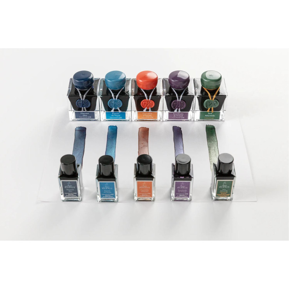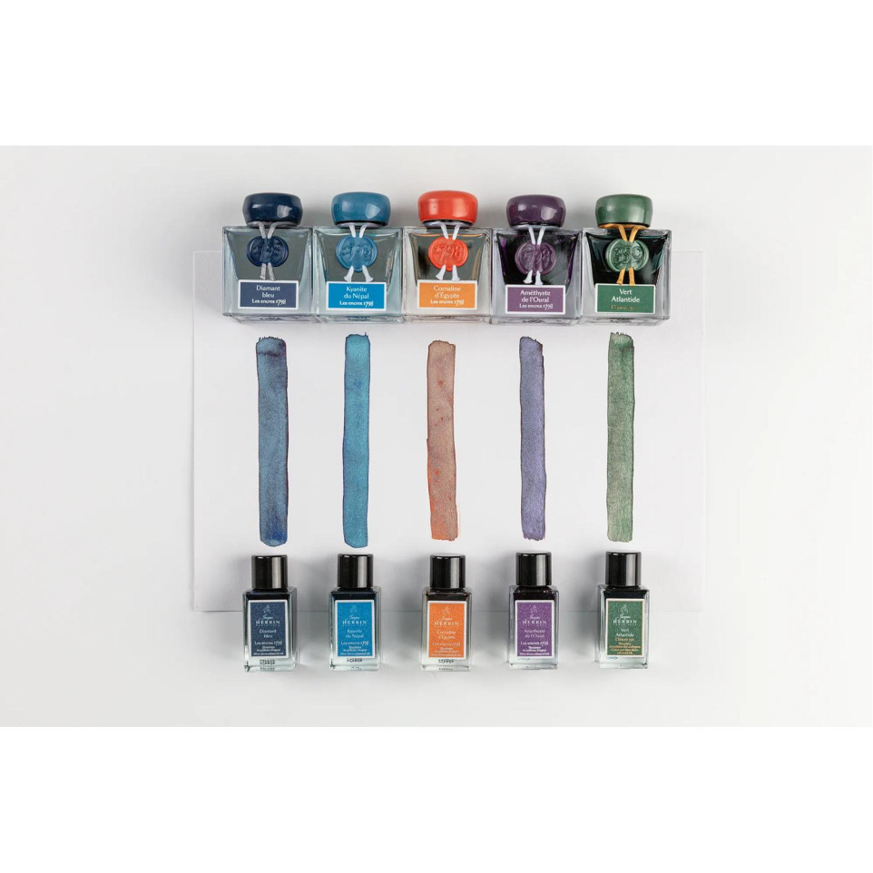 Encre 1798 à paillettes argentées 15ml  Les Encres 1798, de la Collection exclusive Jacques HERBIN Prestige, fêtent la date de production originale des encres Jacques HERBIN, événement décisif dans l'histoire de la maison fondée en 1670. Ces couleurs intenses et profondes sont illuminées du miroitement de paillettes argentées. Les encres 1798 sont véganes et sont pour stylo-plume, stylo roller, plume de verre et porte-plume. Ce flacon, en verre, très élégant, de 15ml vous permettra de le transporter facilement partout pour illuminer tous vos écrits. La cornaline d'Egypte de couleur ocre, inspirée de la pierre précieuse, est sublimée grâce à ses paillettes argentées qui brillent de mille feux. Elle apporte ainsi chaleur et élégance aux différents écrits. Fabriqué en France.