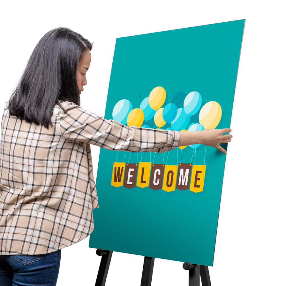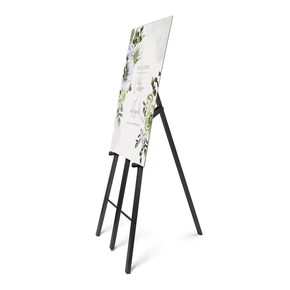 Le chevalet se positionne sur une surface plane pour maintenir et exposer des panneaux ou documents. Il convient aux espaces commerciaux, salons professionnels, zones d'accueil et points de vente, offrant une présentation soignée et visible.