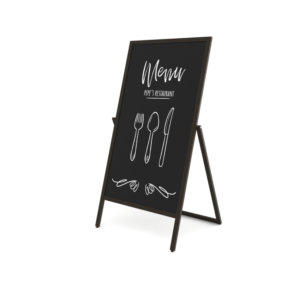 Le chevalet se positionne debout sur ses pieds et le panneau pivote facilement pour alterner entre les deux faces. Il s'utilise pour afficher des menus, des annonces ou des messages directionnels dans des commerces, salons, hôtels ou espaces d'accueil couverts.