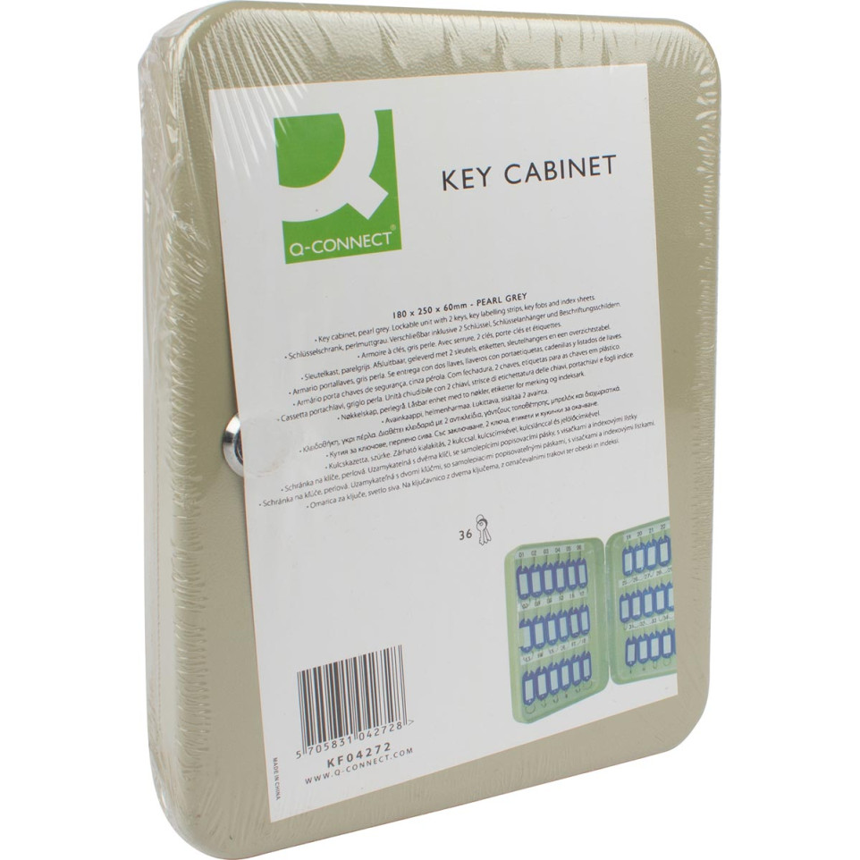 Armoire à clés Q-CONNECT en tôle d’acier gris, conçue pour organiser et sécuriser jusqu’à 36 clés. Idéale pour les bureaux, établissements scolaires ou sites industriels nécessitant une gestion centralisée des clés.