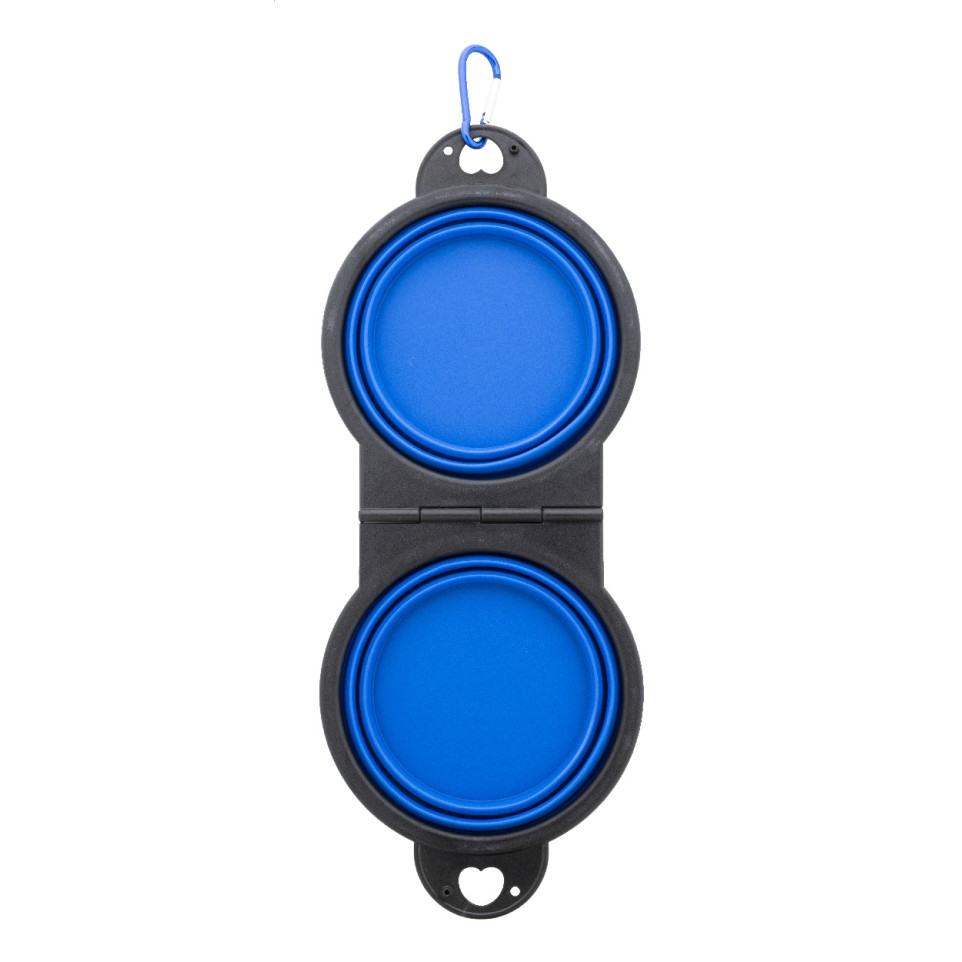 Gamelle pliable Chappy Plus bleue, conçue en TPE robuste, comprenant deux compartiments de 450 ml chacun, idéale pour nourrir et hydrater votre chien lors de déplacements ou promenades. Dotée d’un mousqueton aluminium assorti pour une fixation facile au sac ou à la laisse.