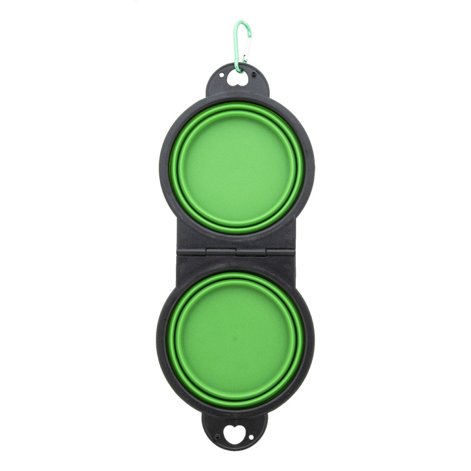 Gamelle pliable Chappy Plus verte pour chien, idéale en déplacement ou lors de balades. Deux compartiments de 450 ml permettent d’offrir eau et nourriture à votre animal simultanément, le tout dans un format compact et léger.