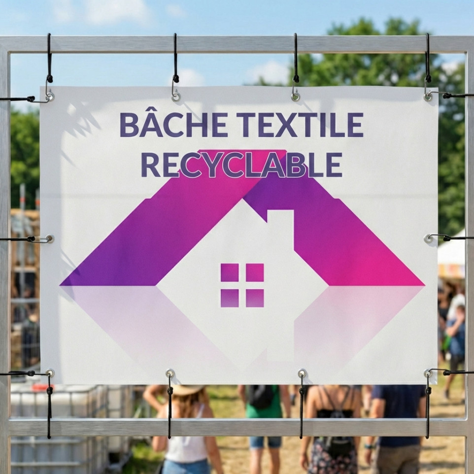 La bâche est fabriquée en polyester 100% recyclable, légère et résistante, adaptée pour un usage professionnel ou événementiel.