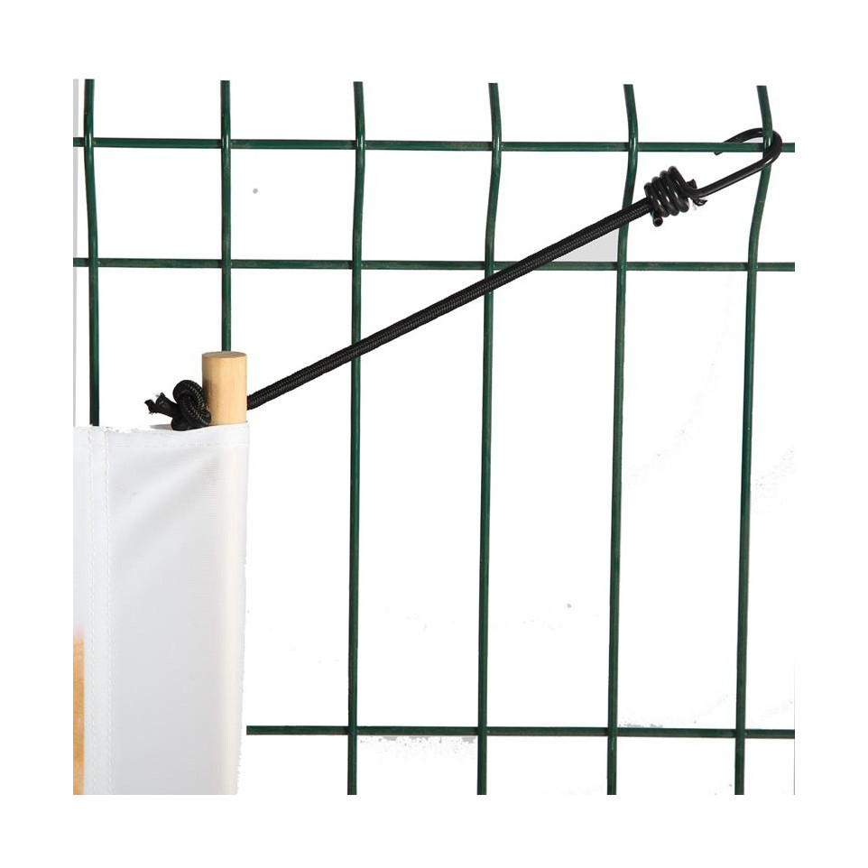 Ce calicot inclut aussi 2 ourlets soudés et cousus (à gauche et à droite du visuel) ainsi que 2 tourillons avec tendeurs et crochets pour simplifier son installation entre 2 poteaux, 2 piquets, sur une barrière, un grillage, une clôture...