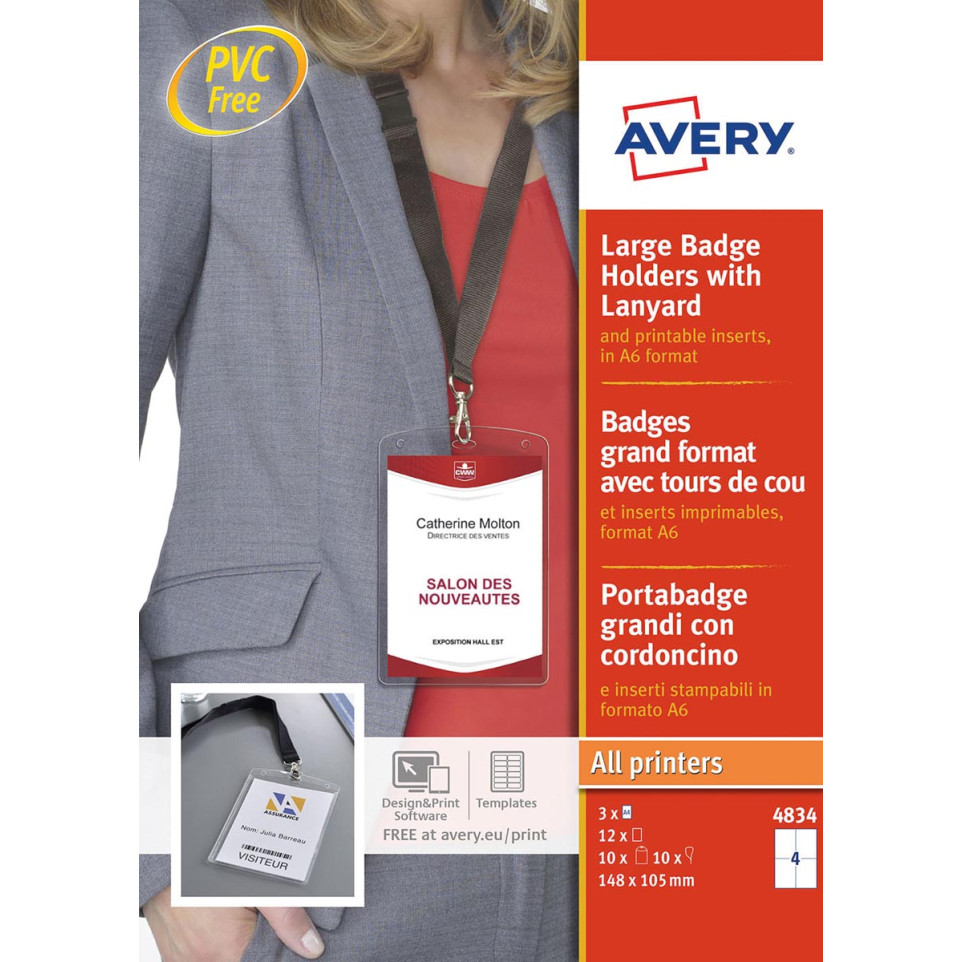 Avery badge grand format, ft 10,5 x 14,8 cm, inserts inclus, boîte de 50 pièces