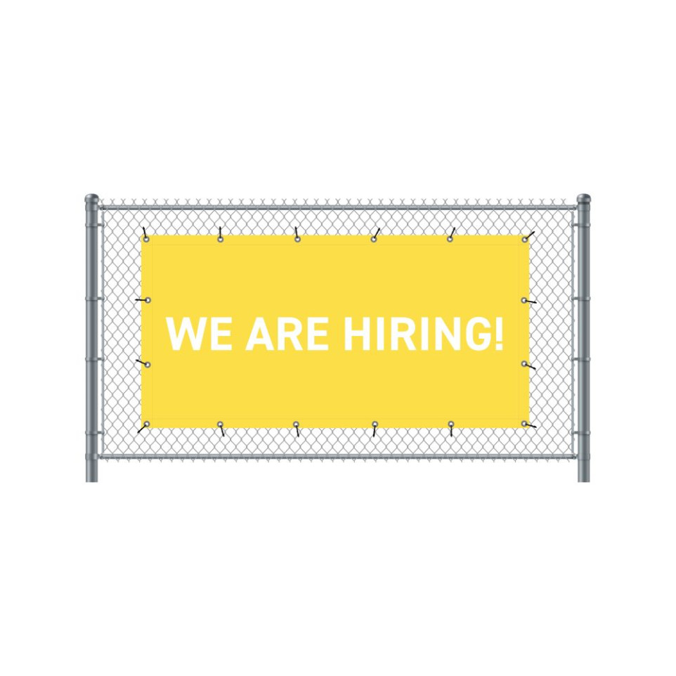La Bannière Fence 200 x 100 cm Nous Recrutons en anglais, coloris jaune, est une bannière publicitaire extérieure conçue pour signaler efficacement vos offres de recrutement sur clôtures, murs ou bâtiments.