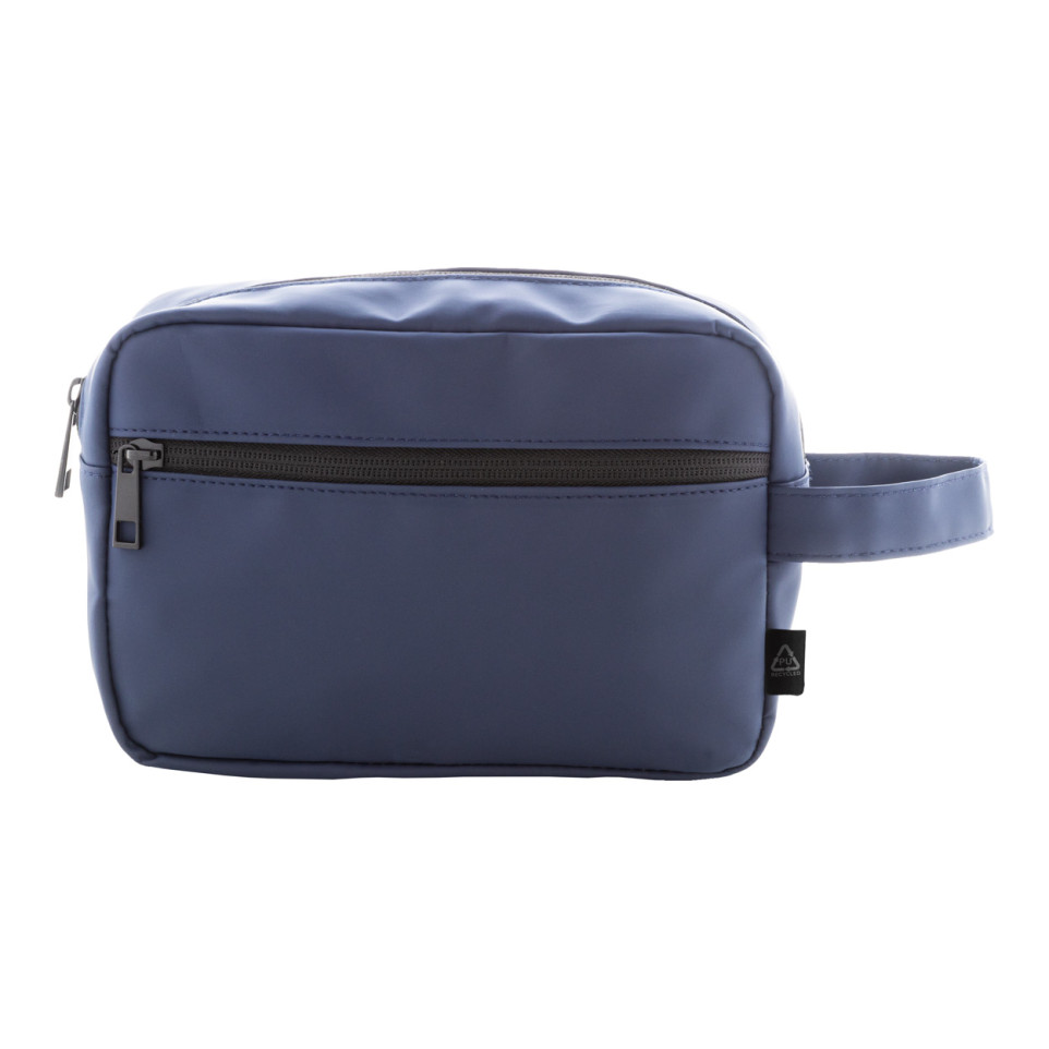 Trousse de toilette Cospu bleu en PU recyclé souple dotée de deux compartiments zippés pratiques et d'une poignée ergonomique pour faciliter le transport. Idéale pour organiser vos essentiels d'hygiène lors de vos déplacements.