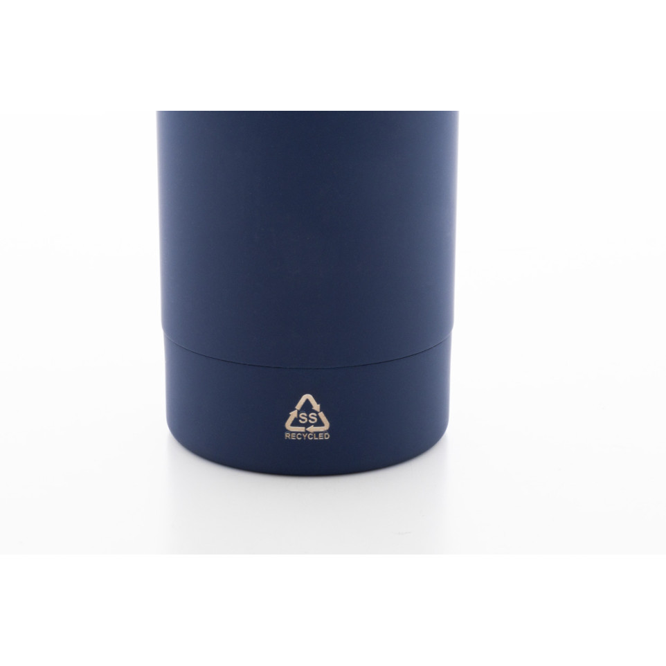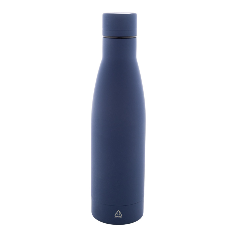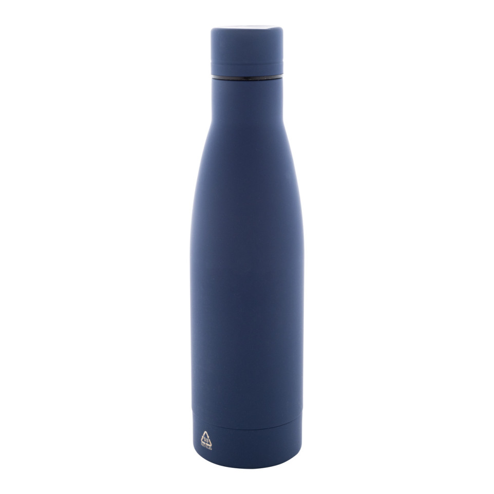 Bouteille en acier inoxydable recyclé avec une élégante finition caoutchoutée bleue foncée. D'une contenance de 750 ml, elle est idéale pour les activités sportives et les déplacements quotidiens, alliant durabilité et style.