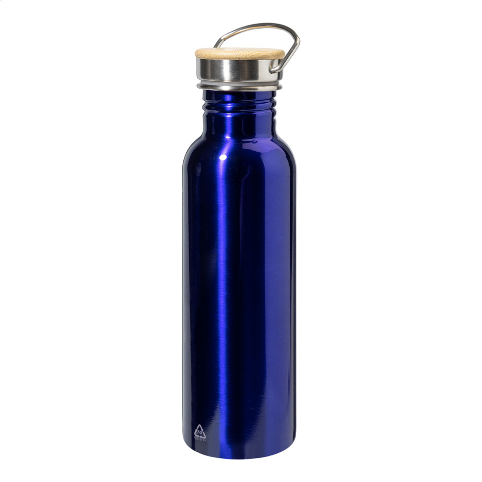 La bouteille Nanga bleue est une gourde en acier inoxydable recyclé de 750 ml, dotée d'un couvercle en bambou, idéale pour une hydratation quotidienne écoresponsable, au bureau ou en déplacement.