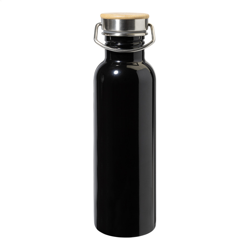 La bouteille Nanga noir est une gourde en acier inoxydable recyclé de 750 ml, idéale pour accompagner les activités sportives et le quotidien, avec un couvercle en bambou naturel.