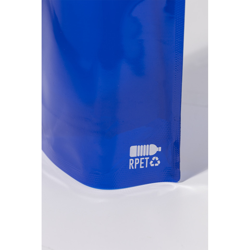La Carabol bleu est une gourde pliable de 500 ml fabriquée en RPET recyclé, équipée d'un bouchon et d'un mousqueton en aluminium, idéale pour une hydratation pratique au quotidien ou lors d'activités sportives.