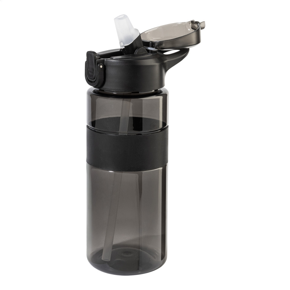 La gourde Fitgrip noire est un bidon de sport en RPET de 700 ml, équipé d'une poignée en silicone et d'un bouchon à clapet automatique avec paille intégrée, idéal pour une hydratation pratique lors des activités sportives.