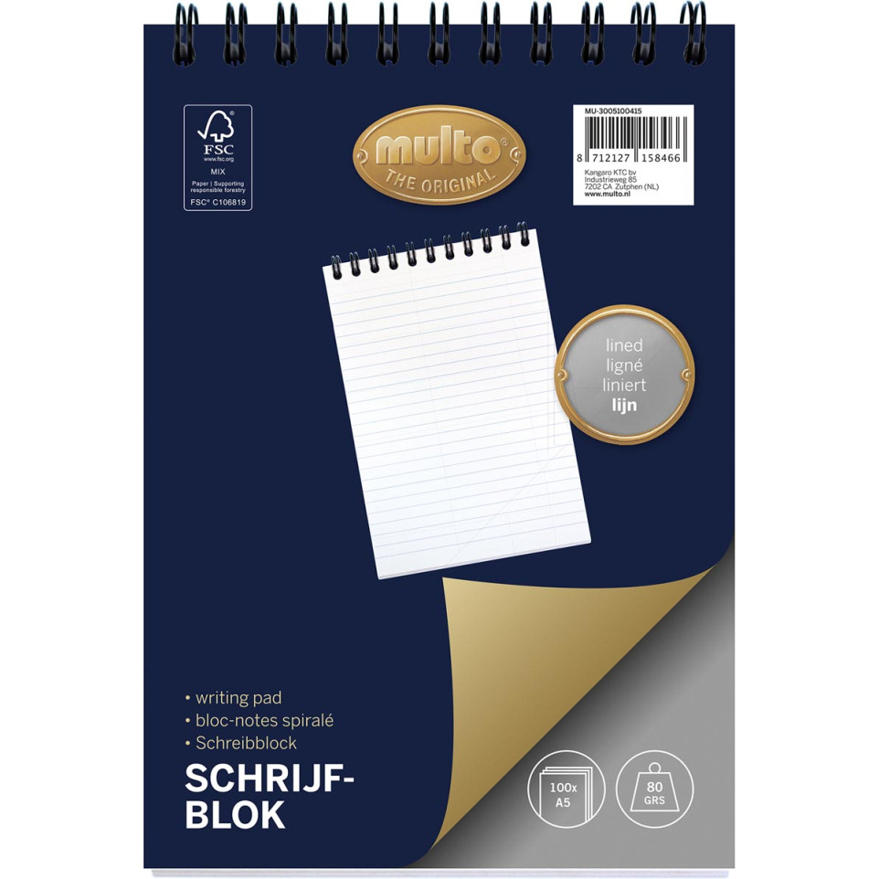Bloc-notes Multo à spirale en haut, format A5 (16,5 x 21 cm), ligné, 100 feuilles, conçu pour la prise de notes quotidienne en milieu scolaire ou professionnel.