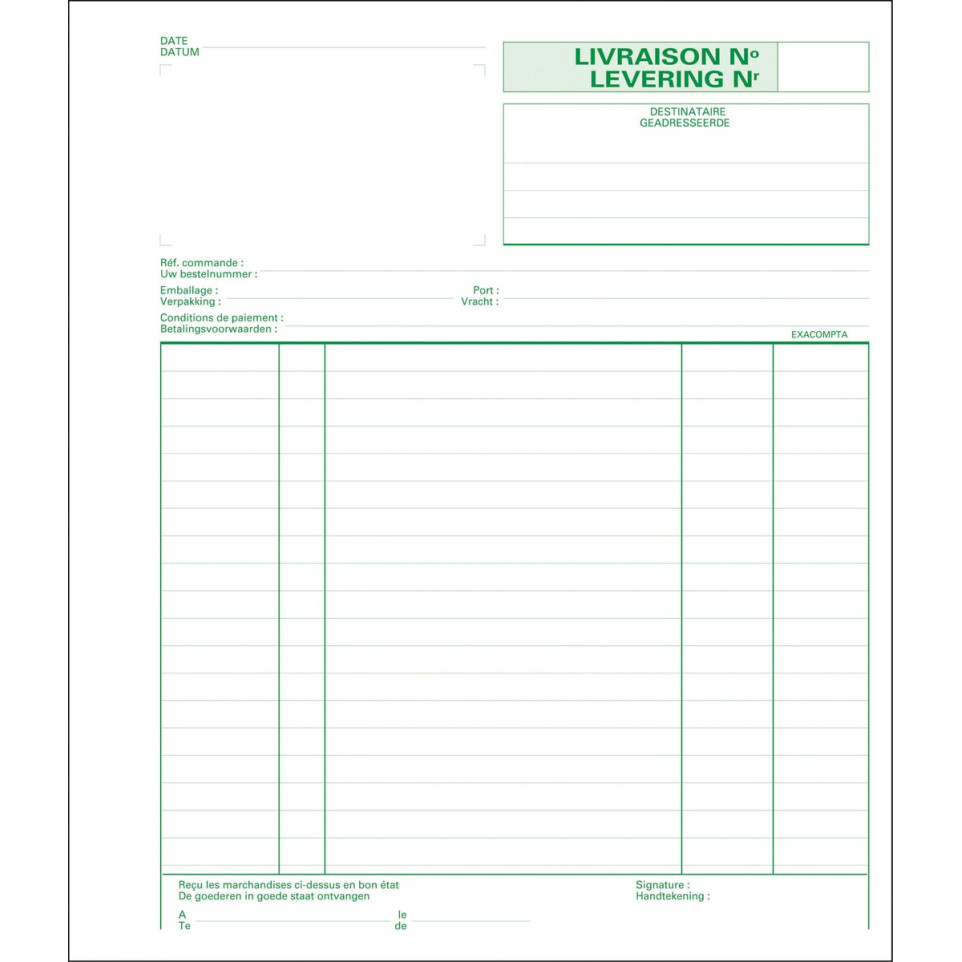 Carnet de livraison autocopiant Exacompta, format vertical 21 x 18 cm, bilingue français/néerlandais, conçu pour établir clairement chaque bon de livraison tout en conservant un duplicata, adapté à l'usage professionnel intensif au bureau ou en déplacement.