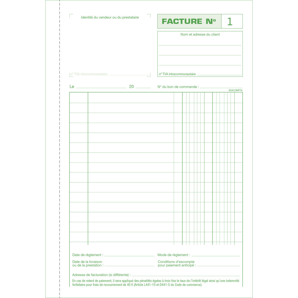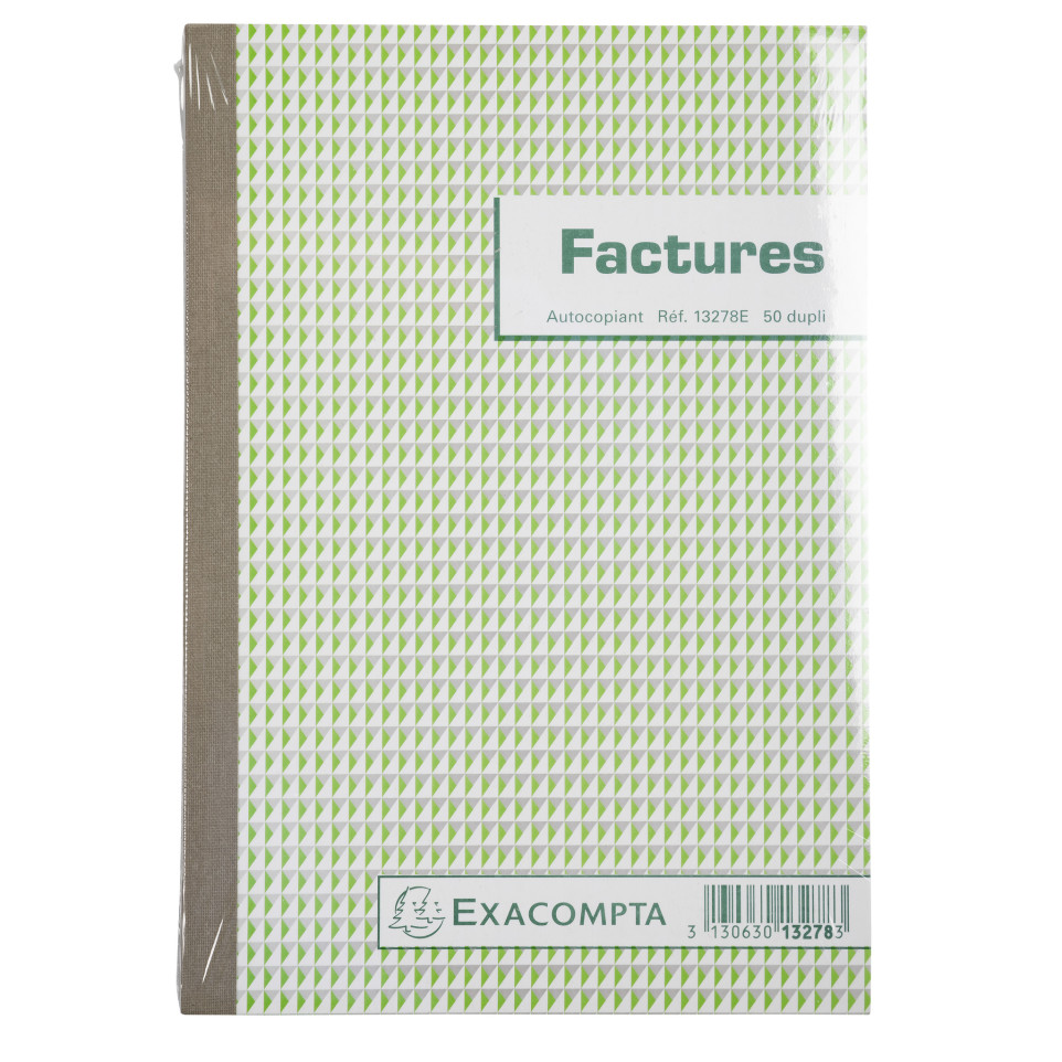 Manifold Factures 21x14,8cm 50 feuillets dupli autocopiants Modèle simple, sans mention de la TVA. 50 feuillets numérotés et autocopiants en 2 exemplaires (1 original + 1 copie). Le 1er feuillet est microperforé et se détache facilement, le 2ème feuillet reste dans le carnet. La qualité du papier autocopiant garantit une copie propre et rapide avec une excellente transcription de l'original. Grâce à une colle de qualité supérieure et un dos renforcé, les manifolds Exacompta sont adaptés à une utilisation intensive, au bureau comme à l'extérieur. Fabrication 100% française.
