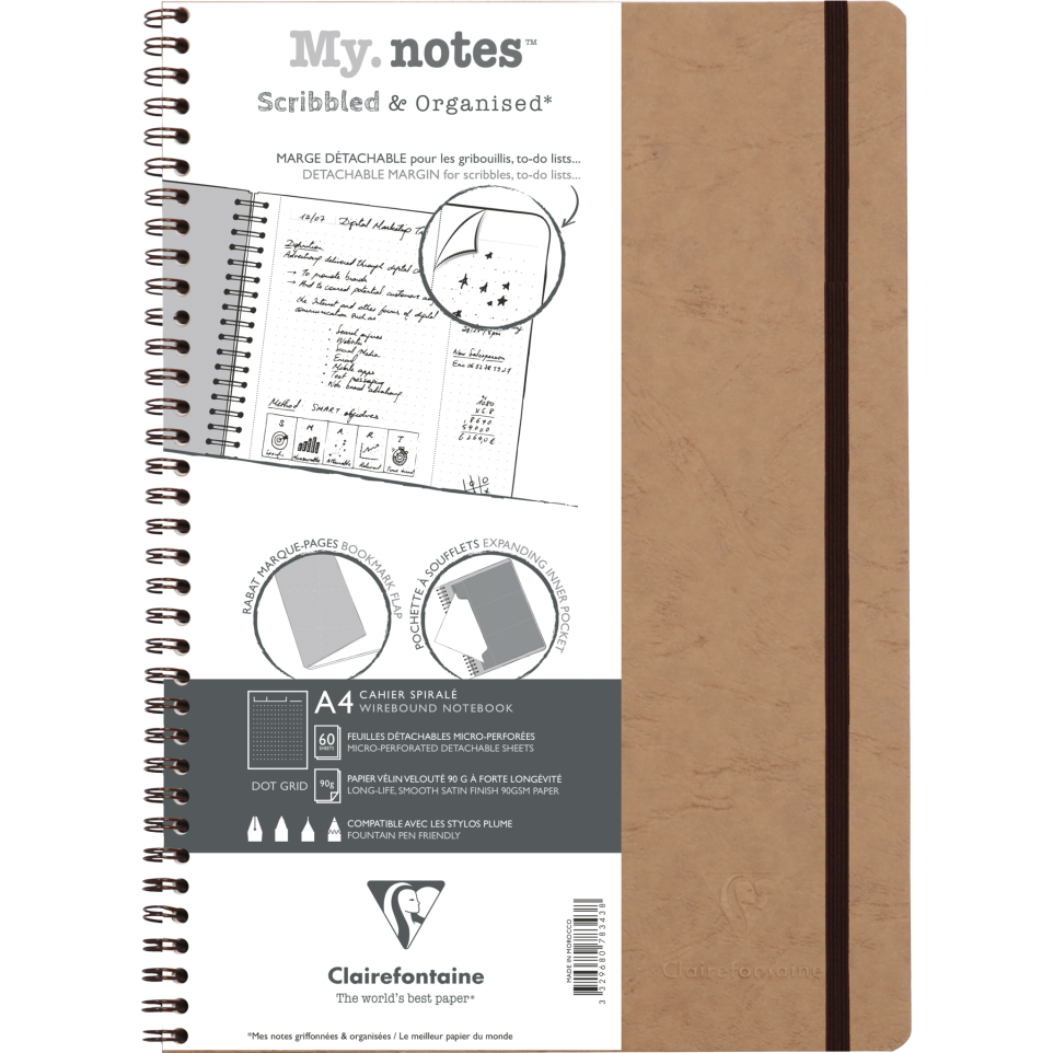 My.Notes Age Bag cahier reliure intégrale à marges détachables A4 120 pages détachables DOT + cadre en-tête Le cahier à marges détachables, pour griffonner plus malin et organisé : griffonnez dans la marge (un numéro de téléphone lors d'un appel, des calculs ou des dessins pendant une réunion, voire vos to-do lists), puis détachez-la facilement, pour ne conserver que l'essentiel de vos notes au propre sur l'autre partie de la page ! Un rabat marque-page à l'avant + une pochette de rangement à soufflets à l'arrière. Fermeture par élastique assorti à la couverture. Collection AGE BAG, authentique et intemporelle. Au quotidien ou en voyage au bout du monde, les cahiers Clairefontaine AGE BAG recueillent vos pensées où que vous soyez. Envie d'évasion ou simplement d'authenticité ? Emportez-les partout avec vous ! Couverture en carte teintée dans la masse imitant le grain du cuir : durable et résistante ! Papier Clairefontaine Vélin Velouté 90 g, pour une sensation de glisse unique, fabriqué en France et certifié PEFC, pour la gestion durable des forêts. Produit façonné à la main.