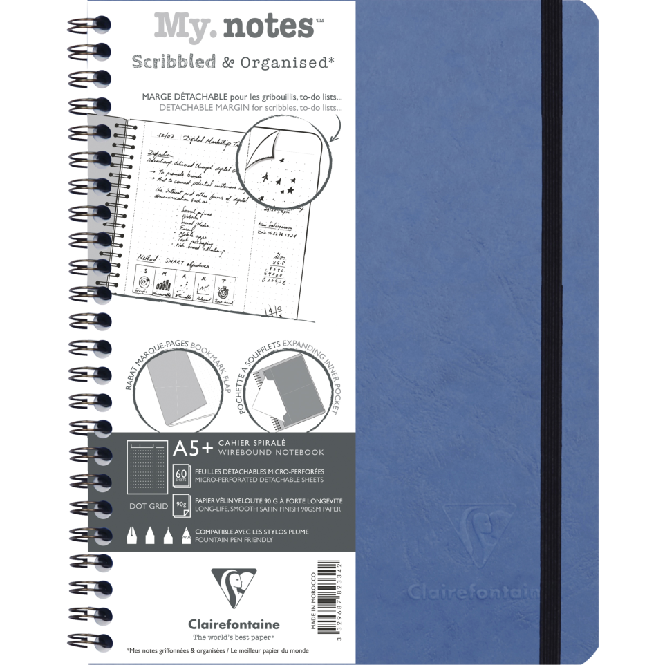 My.Notes Age Bag carnet reliure intégrale à marges détachables A5+ 120 pages détachables DOT + cadre en-tête Le carnet à marges détachables, pour griffonner plus malin et organisé : griffonnez dans la marge (un numéro de téléphone lors d'un appel, des calculs ou des dessins pendant une réunion, voire vos to-do lists), puis détachez-la facilement, pour ne conserver que l'essentiel de vos notes au propre sur l'autre partie de la page ! Un rabat marque-page à l'avant + une pochette de rangement à soufflets à l'arrière. Fermeture par élastique assorti à la couverture. Collection AGE BAG, authentique et intemporelle. Au quotidien ou en voyage au bout du monde, les cahiers Clairefontaine AGE BAG recueillent vos pensées où que vous soyez. Envie d'évasion ou simplement d'authenticité ? Emportez-les partout avec vous ! Couverture en carte teintée dans la masse imitant le grain du cuir : durable et résistante ! Papier Clairefontaine Vélin Velouté 90 g, pour une sensation de glisse unique, fabriqué en France et certifié PEFC, pour la gestion durable des forêts. Produit façonné à la main.