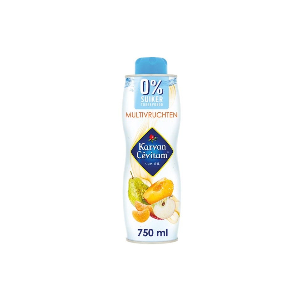 Sirop multifruit Karvan Cévitam, bouteille de 60 cl, sans sucre, offrant une boisson fruitée légère, idéale pour préparer rapidement des boissons rafraîchissantes à base de 75% de fruits, enrichies en vitamines.