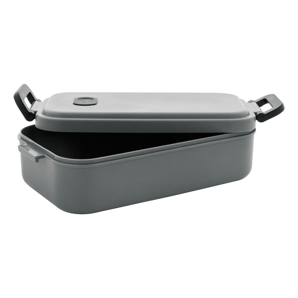 Boîte à lunch en plastique PP gris avec couvercle hermétique, valve en silicone et fermeture à boucle. D'une capacité de 1000 ml, elle est idéale pour transporter vos repas au quotidien.