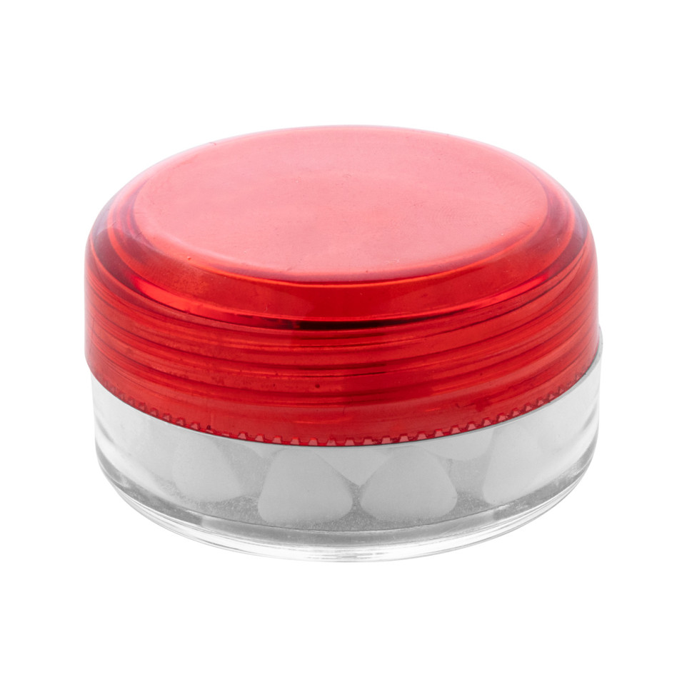 Pot à menthe TwistMint rouge en plastique transparent avec couvercle à vis coloré, contenant environ 12 grammes de bonbons mentholés sans sucre. Idéal pour rafraîchir l'haleine à tout moment de la journée.