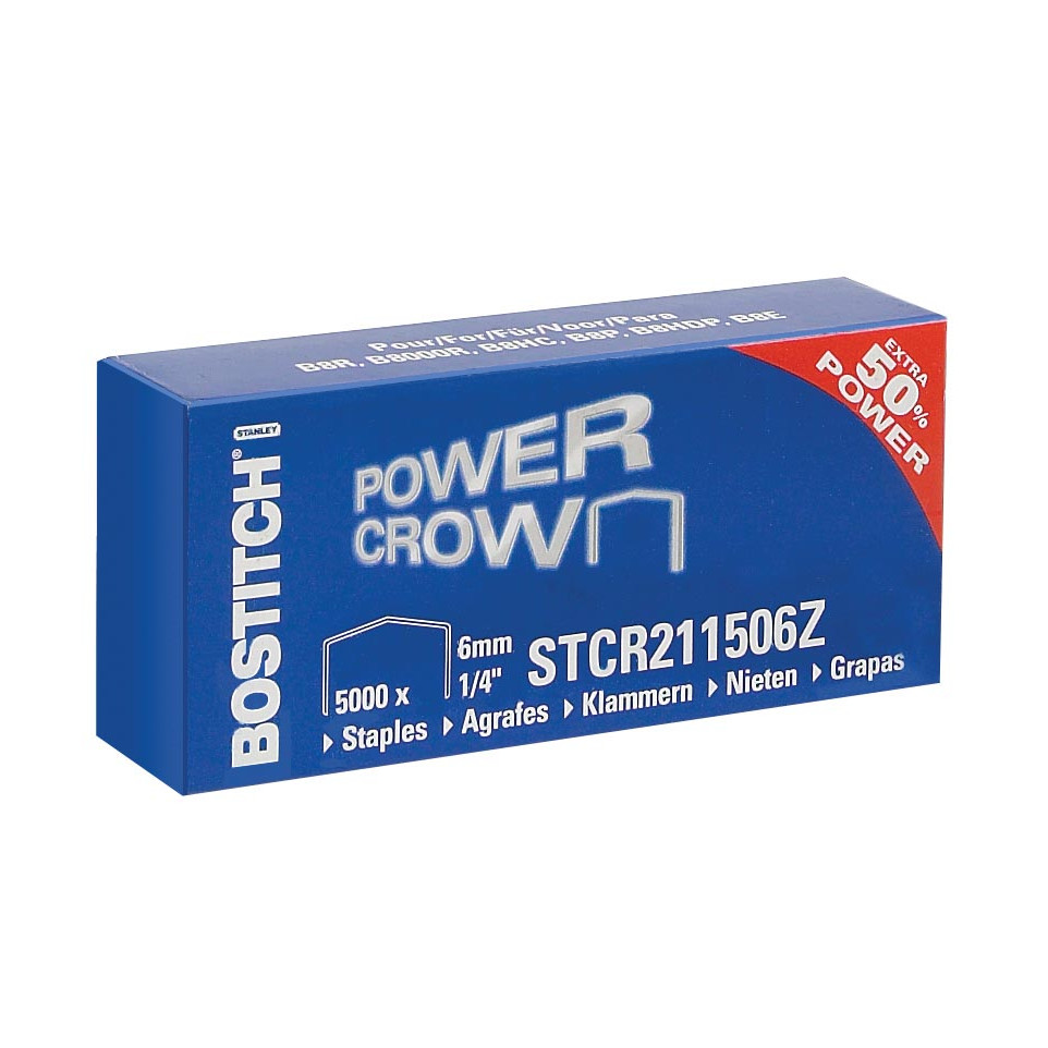 Agrafes Bostitch STCR211506Z de 6 mm, adaptées aux agrafeuses B8R, B8HC, B8HDP, B8P et B8E. Idéales pour un usage quotidien en bureau, elles permettent d’agrafer efficacement documents et rapports. Conditionnées en boîte de 5 000.