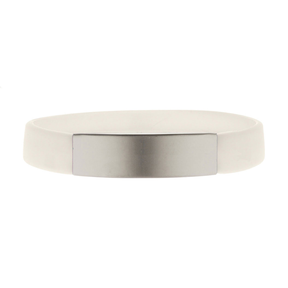 Bracelet en silicone blanc avec une plaque en aluminium argenté, idéal pour une utilisation quotidienne comme accessoire de mode ou objet promotionnel lors d’événements professionnels.