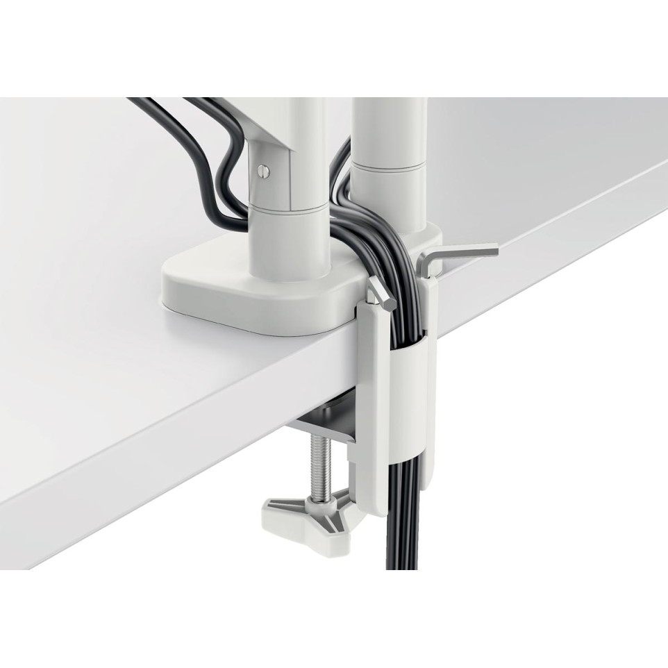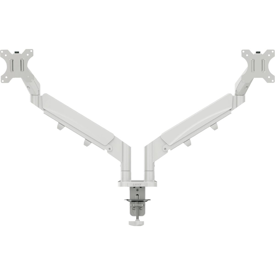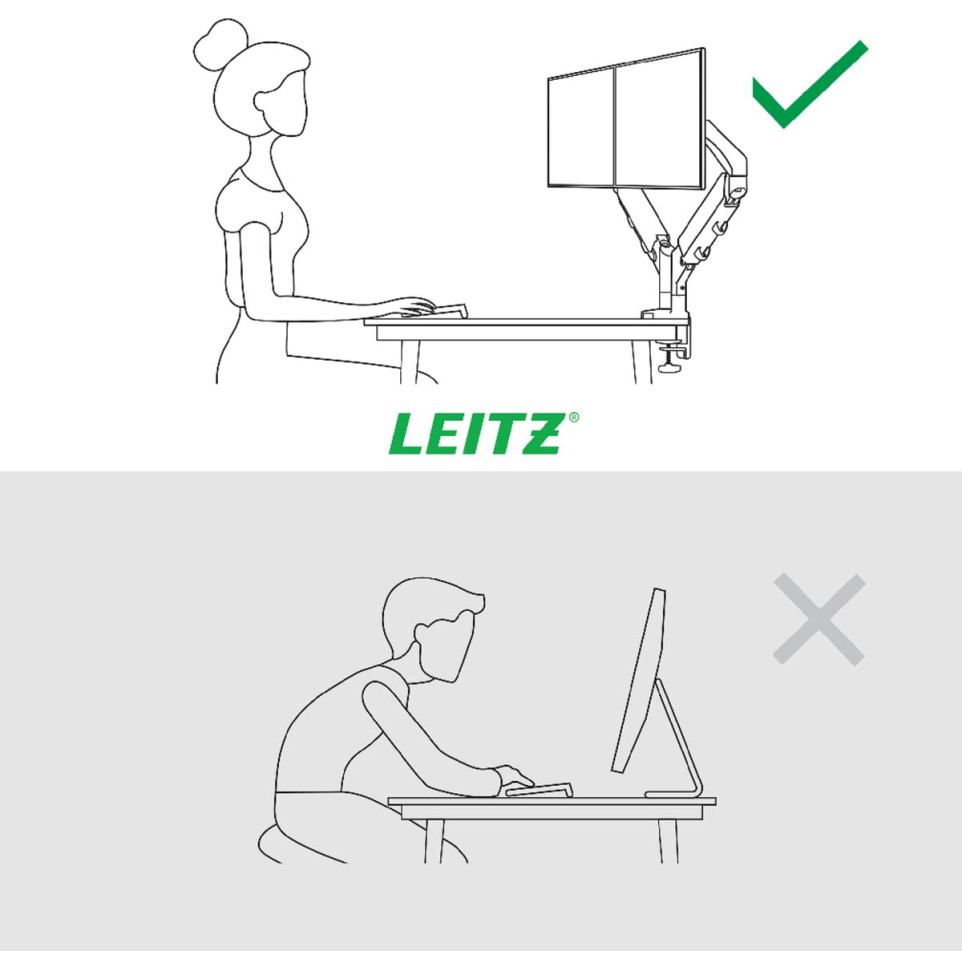 Bras double ergonomique pour deux écrans de 17 à 32 pouces, conçu pour améliorer la posture et libérer l'espace de travail. Idéal pour les petits bureaux et les espaces partagés.