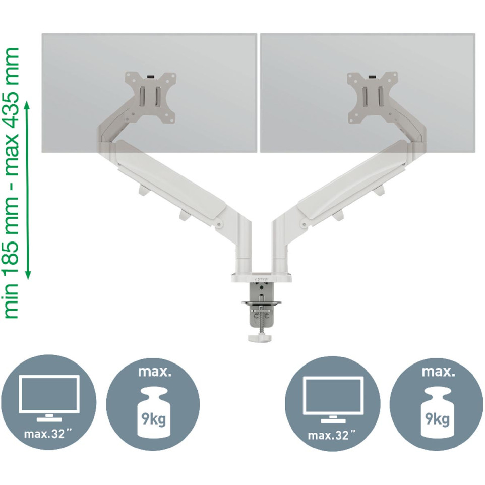 Quels types d'écrans puis-je installer ? – Le bras accueille deux écrans LCD de 17 à 32 pouces pesant chacun jusqu'à 9 kg, avec interface VESA 75 x 75 mm ou 100 x 100 mm.