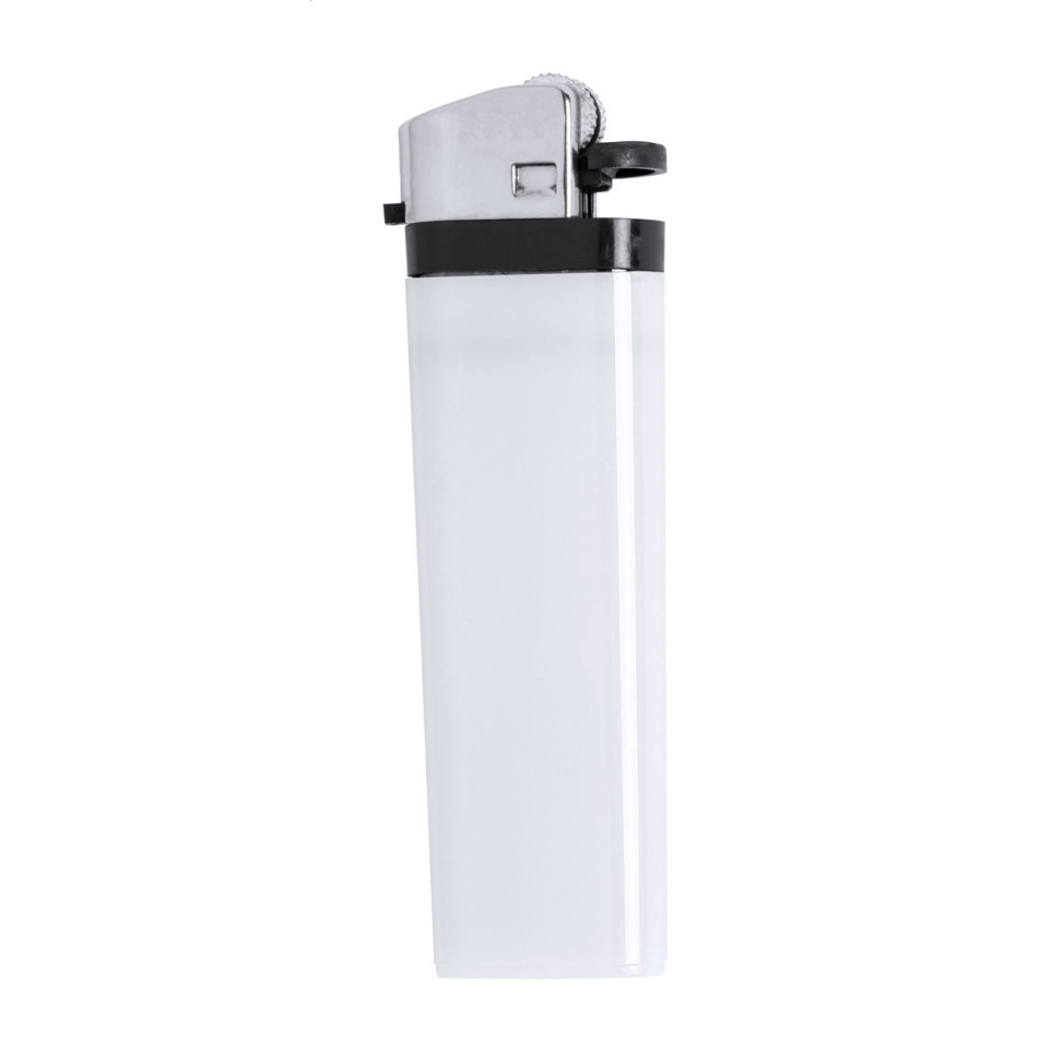 Briquet en plastique blanc Zylin à usage unique. Ce briquet sécurisé est préalablement rempli de gaz et conçu pour un usage promotionnel en grandes quantités.