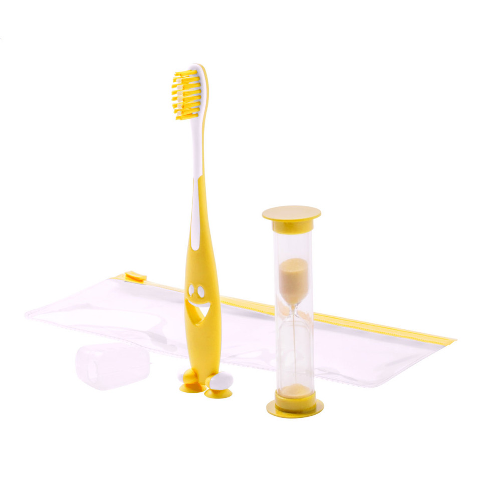 Set de brosse à dents en plastique pour enfants comprenant une brosse à dents jaune et un sablier minuteur pour encourager un brossage minuté, le tout emballé dans un étui zippé transparent, idéal pour les déplacements ou l’école.