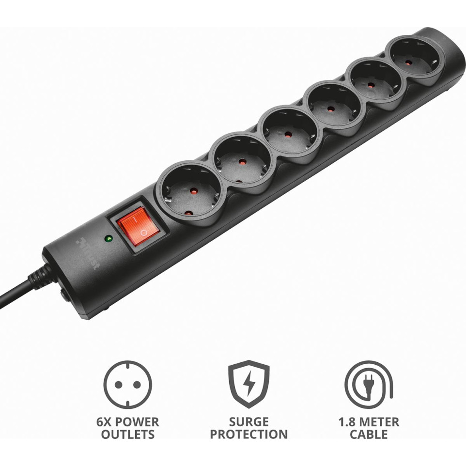 La multiprise Trust Surge Guard offre une protection efficace contre les surtensions pour jusqu’à 6 appareils électroniques simultanément, idéale pour les équipements de bureau, informatiques ou multimédias à la maison comme au travail.