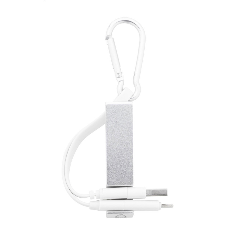 Câble de chargement USB multifonction équipé d’un mousqueton en aluminium recyclé, faisant aussi office de support pour smartphone et décapsuleur. Idéal pour charger différents appareils lors de déplacements, au bureau ou au quotidien.
