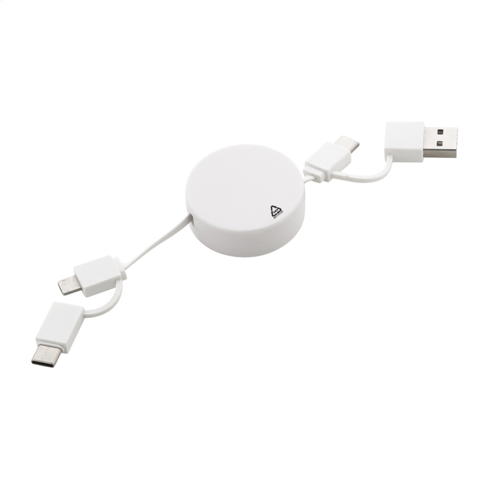 Le câble chargeur USB télescopique Rascop blanc est fabriqué en ABS recyclé, offrant une solution de chargement polyvalente avec connecteurs micro USB, USB-C et Lightning. Sa conception rétractable permet un rangement facile et sans encombrement.