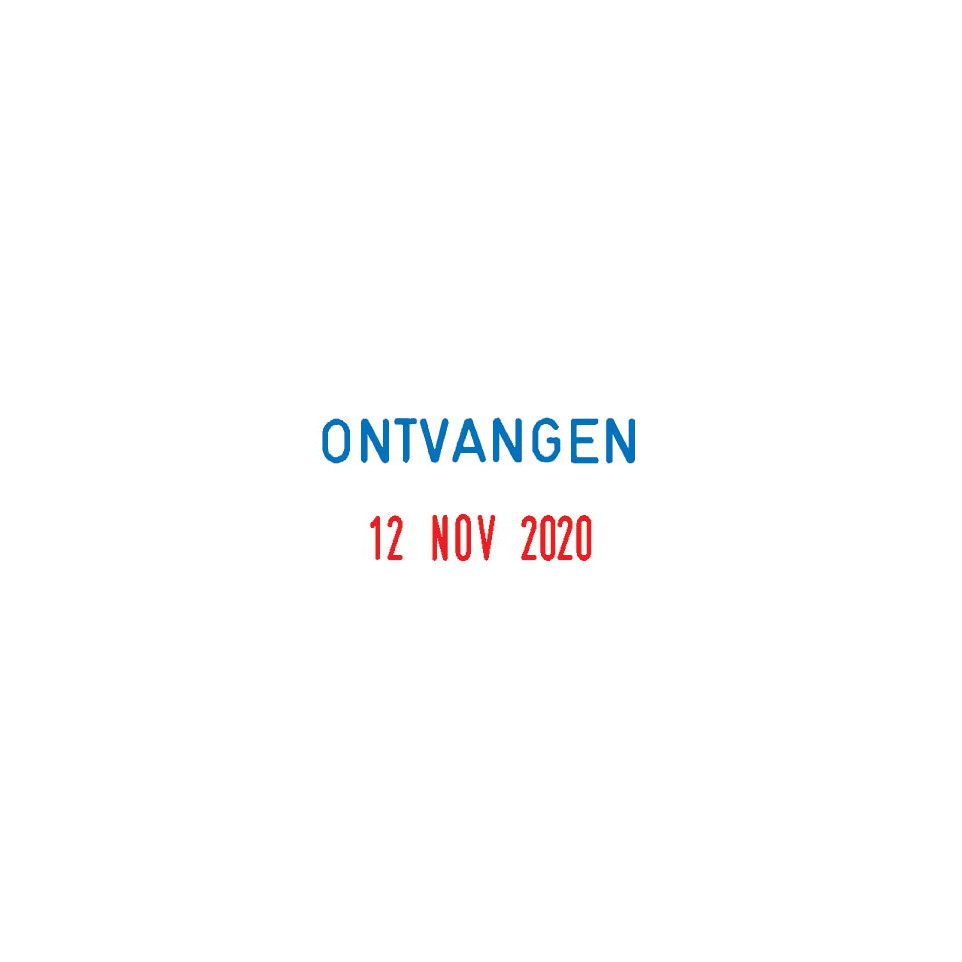 Tournez les molettes pour régler la date, puis appuyez sur le tampon : le texte « ONTVANGEN » s’imprime en bleu au-dessus d’une date en rouge. Convient pour tamponner factures, courriers et dossiers entrants, garantissant une identification immédiate de la réception.