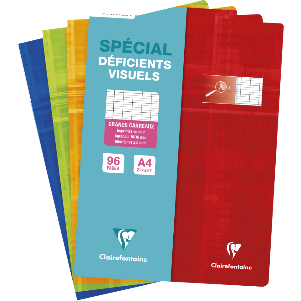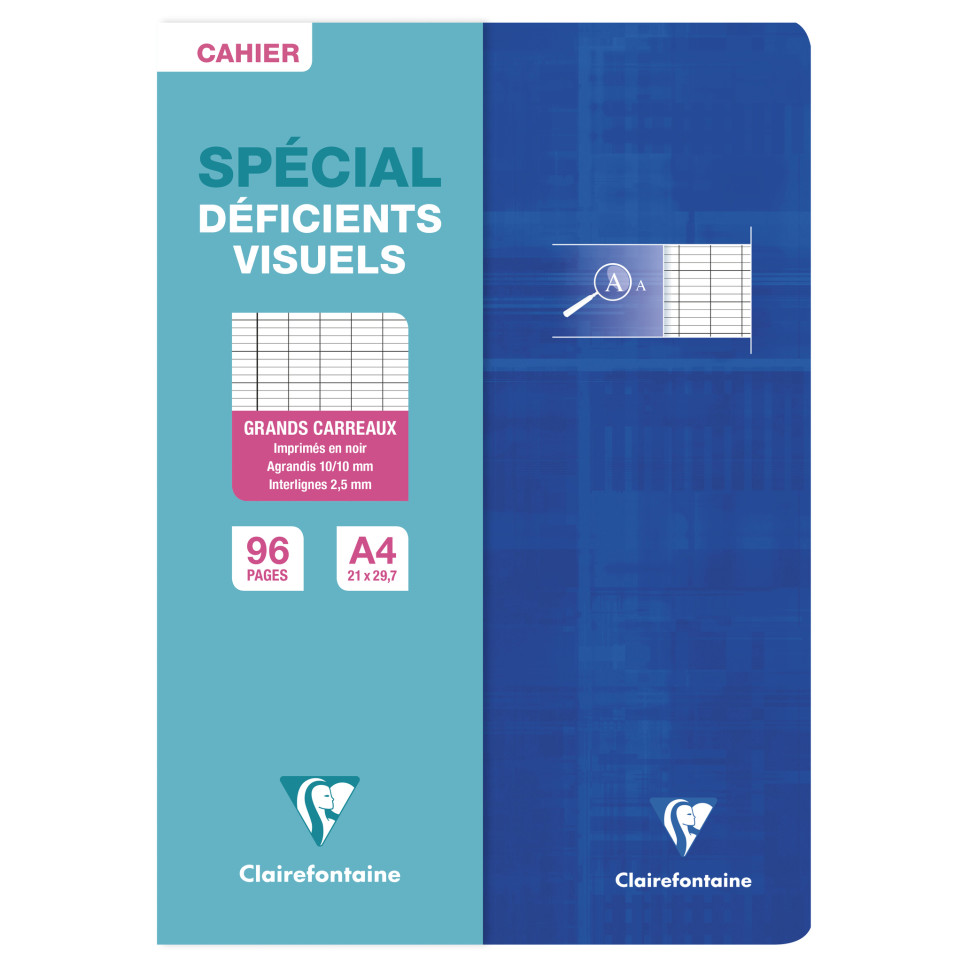Cahier piqué spécial déficients visuels A4 96 pages grands carreaux 2 ,5mm agrandis 10x10 Dès 1950, Clairefontaine entreprend de proposer des cahiers tranchant par la qualité de leur papier, la gaieté et la solidité de leur couverture, sur les piètres articles de l'époque. Clairefontaine révolutionnera alors l'usage des cahiers et appuiera l'engagement de l'entreprise dans une quête permanente d'amélioration de la qualité. Désormais célèbre pour ses cahiers haut de gamme, Clairefontaine fabrique ses produits à base de papier uniquement avec des pâtes à papier provenant à 100% de forêts certifiées pour leur gestion environnementale. Grâce à des produits parfaitement en phase avec les besoins de tout à chacun, Clairefontaine fait partie intégrante de notre quotidien. Lignage spécial déficients visuels : carreaux agrandis, imprimés en noir avec les lignes primaires et la marge plus marquées que les lignes secondaires. Couverture carte pelliculée brillante et imperméable. Papier Clairefontaine Vélin Velouté 90 g, pour une sensation de glisse unique. Certifié PEFC, pour la gestion durable des forêts. Fabriqué en France.