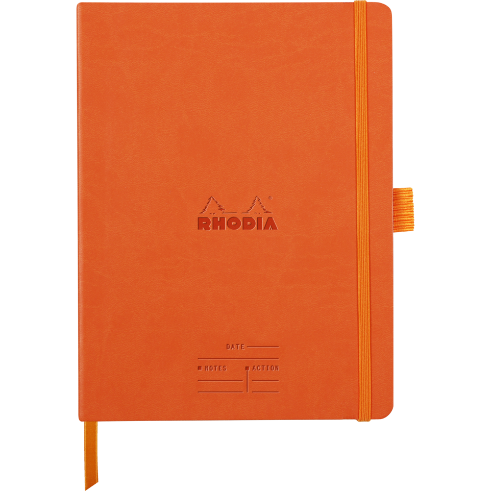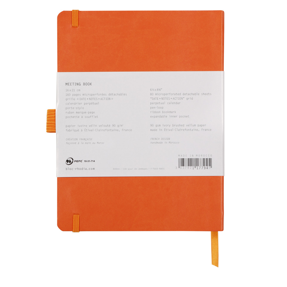 Rhodiarama Meeting A5+ 160 pages microperforé papier blanc 90g avec élastique + p-stylo Couverture souple en simili cuir italien, dos carré collé, logos embossés, fermeture élastique orange, 160 pages microperforées, papier vélin velouté blanc 90 g, calendrier perpétuel, porte-crayon, ruban marque-page, pochette à soufflets et pages de garde orange
