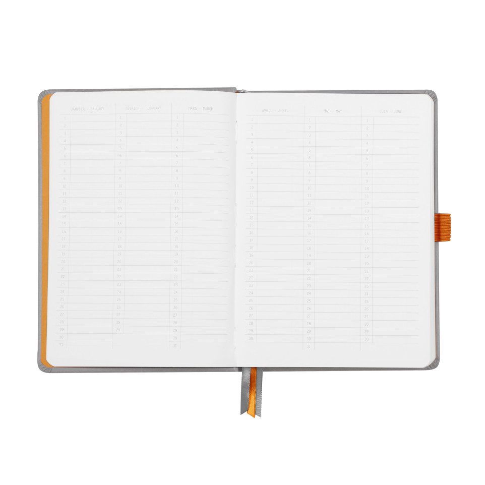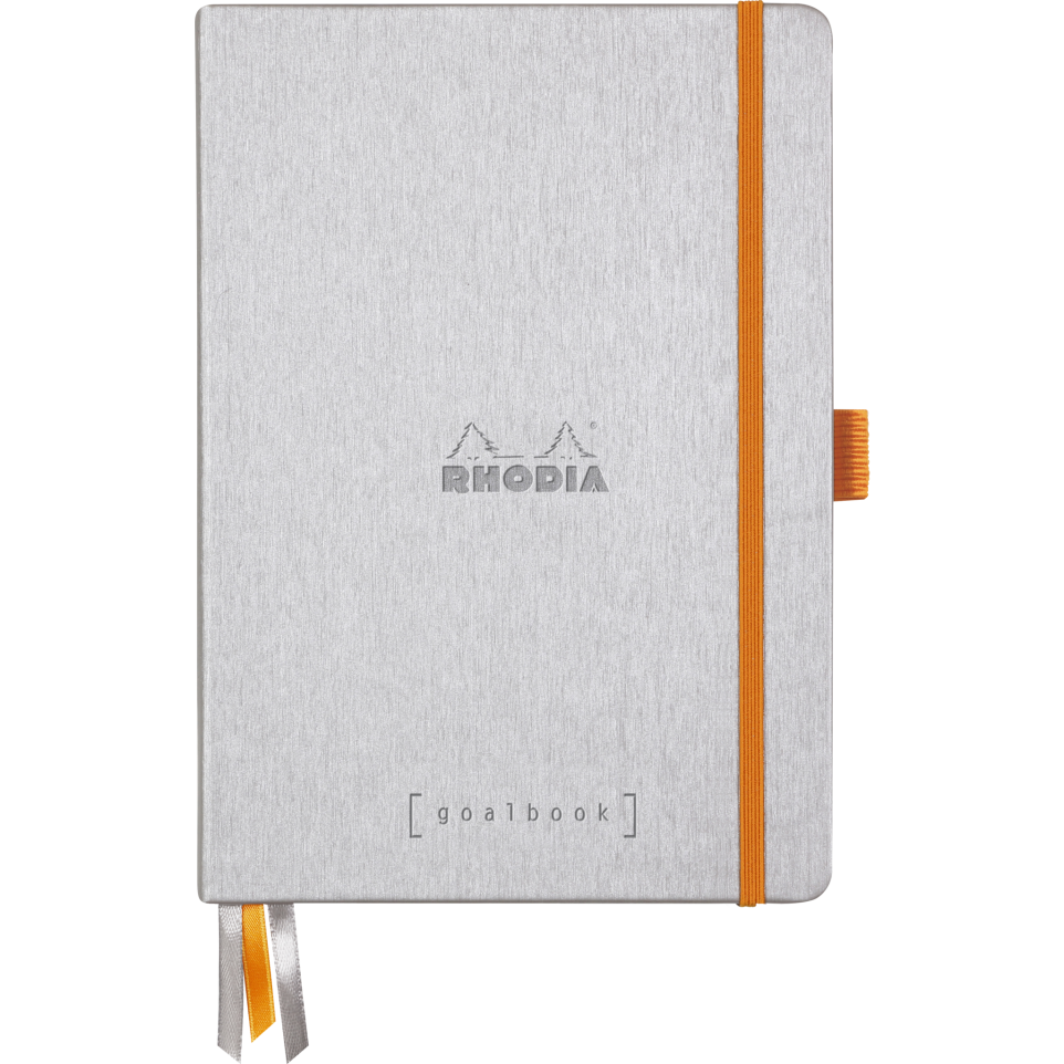 Rhodiarama Goalbook rembordé rigide A5 240 pages dot papier blanc 90g Rhodia Goalbook A5 carnet rembordé rigide 240 pages numérotées DOT papier blanc Le Goalbook est l'outil idéal pour le Bullet Journaling© afin d'organiser son quotidien et ne rien oublier. Ultra-personnalisable grâce à ses 240 pages non perforées dont 224 pages numérotées, 6 pages d?index et 2 calendriers perpétuels. Brochure cousue rembordée rigide, fermeture à élastique, couverture simili cuir italien, logo Rhodia embossé. Trois rubans marque-pages et pochette à soufflet. Filmé individuellement.