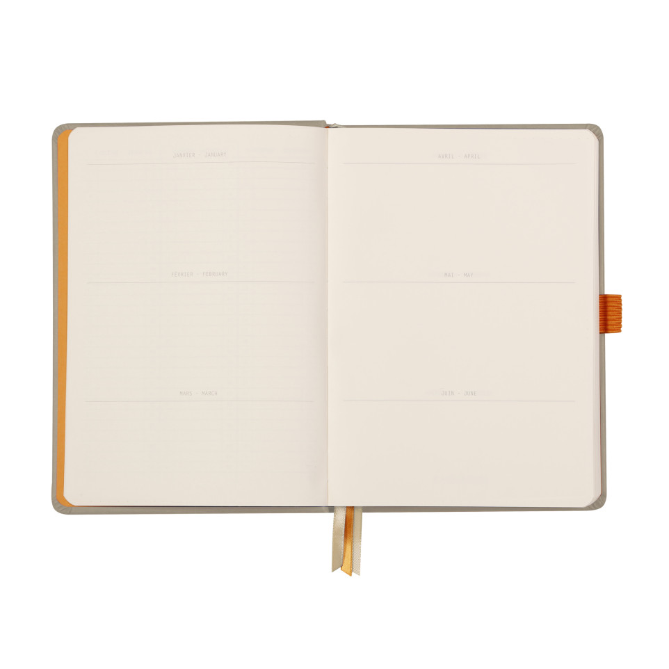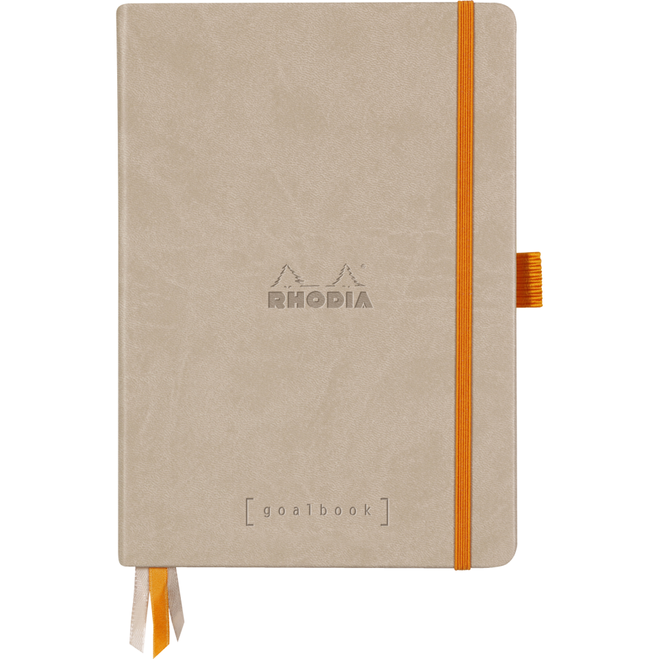 Rhodiarama Goalbook rembordé rigide A5 240 pages dot papier ivoire 90g Rhodia Goalbook A5 carnet rembordé rigide 240 pages numérotées DOT papier ivoire Le Goalbook est l'outil idéal pour le Bullet Journaling© afin d'organiser son quotidien et ne rien oublier. Ultra-personnalisable grâce à ses 240 pages non perforées dont 224 pages numérotées, 6 pages d?index et 2 calendriers perpétuels. Brochure cousue rembordée rigide, fermeture à élastique, couverture simili cuir italien, logo Rhodia embossé. Trois rubans marque-pages et pochette à soufflet. Filmé individuellement.