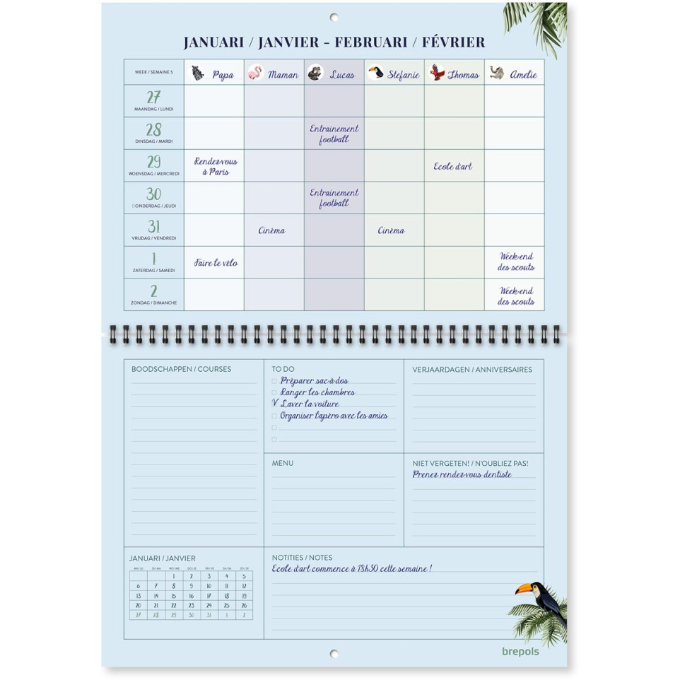 Ce calendrier s’utilise pour planifier efficacement la semaine, noter rendez-vous, échéances et programmes importants. Grâce à sa structure hebdomadaire et ses espaces dédiés, il facilite la gestion simultanée de plusieurs emplois du temps, avec visibilité sur les congés scolaires propres à la Belgique et aux Pays-Bas.
