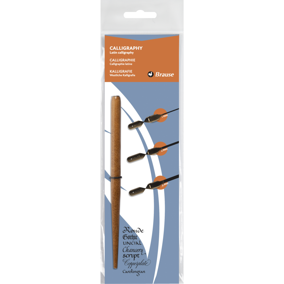 POCHETTE PORTE-PLUME + 3 PLUMES CALLIGRAPHIE Pochette comprenant 1 porte-plume en bois et 3 plumes Bandzug (1/2/3mm) destinées à la calligraphie Latine (Romaine, Onciale, Caroline, Gothique, Chancelière, Ronde). Pochette idéale pour les amateurs de calligraphie ou pour les débutants souhaitant s'entrainer à la calligraphie. Les différentes tailles de plumes donnent des épaisseurs de lettres différentes. Fabriqué en France. Livré par 5.