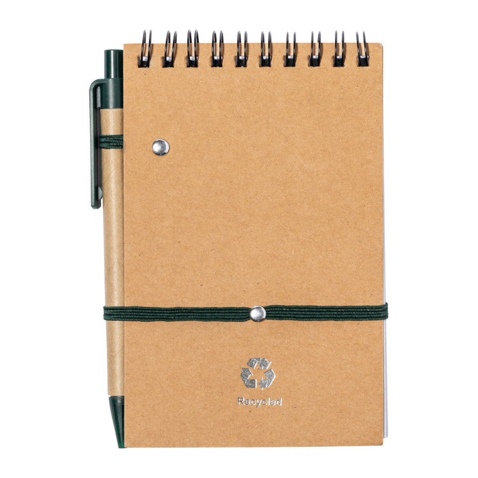 Bloc notes écologique de format A6, composé de 70 feuilles lignées en carton recyclé, accompagné d’un stylo à bille à encre bleue assorti et lui aussi conçu en carton recyclé. Idéal pour les prises de notes quotidiennes au bureau, en réunion ou lors de déplacements.