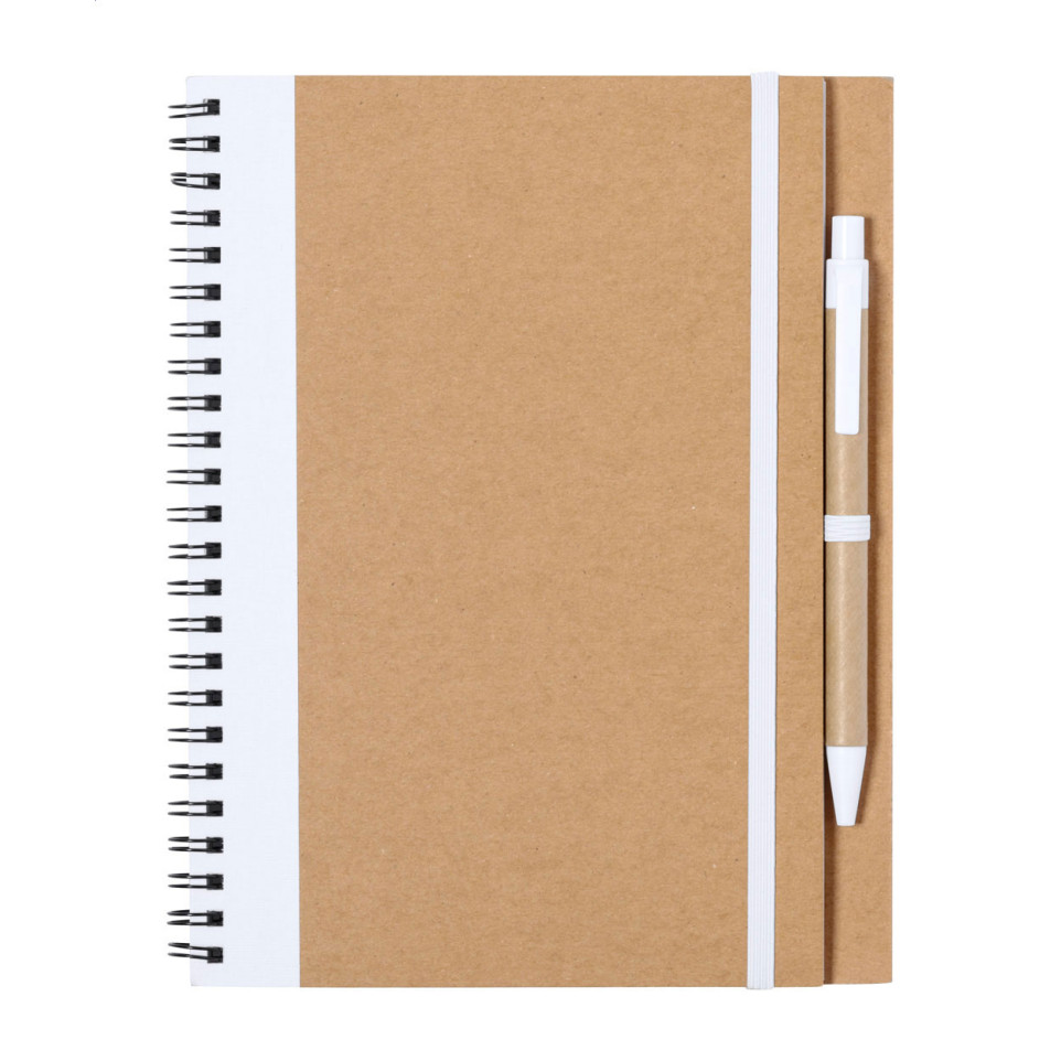 Bloc-notes A5 écologique Platanus en papier recyclé avec 60 pages non lignées, accompagné d'un stylo à bille intégré. Idéal pour les prises de notes professionnelles et les réunions.